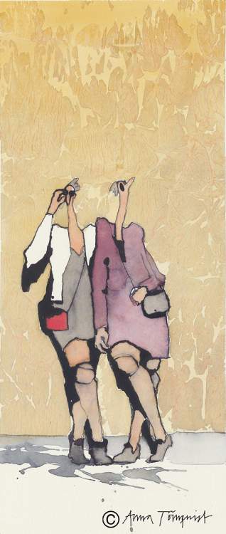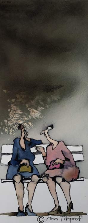Akvarelltanterna har funnits med mig sedan jag fyllde femtio och behövde göra upp med traumat att inträda i ”tant-åldern”. Genom åren har de då och då förvandlats till chics eller häxor eller olika sorters fåniga fåglar, men i någon skepnad har de alltid kommit tillbaka lagom till påskrundan på Österlen och Konstrundan i Majorna. När konstrundorna så deppigt frös inne under pandemin muntrade jag ändå upp mig med några akvarelltanter – och ett par yrvakna påskharar.